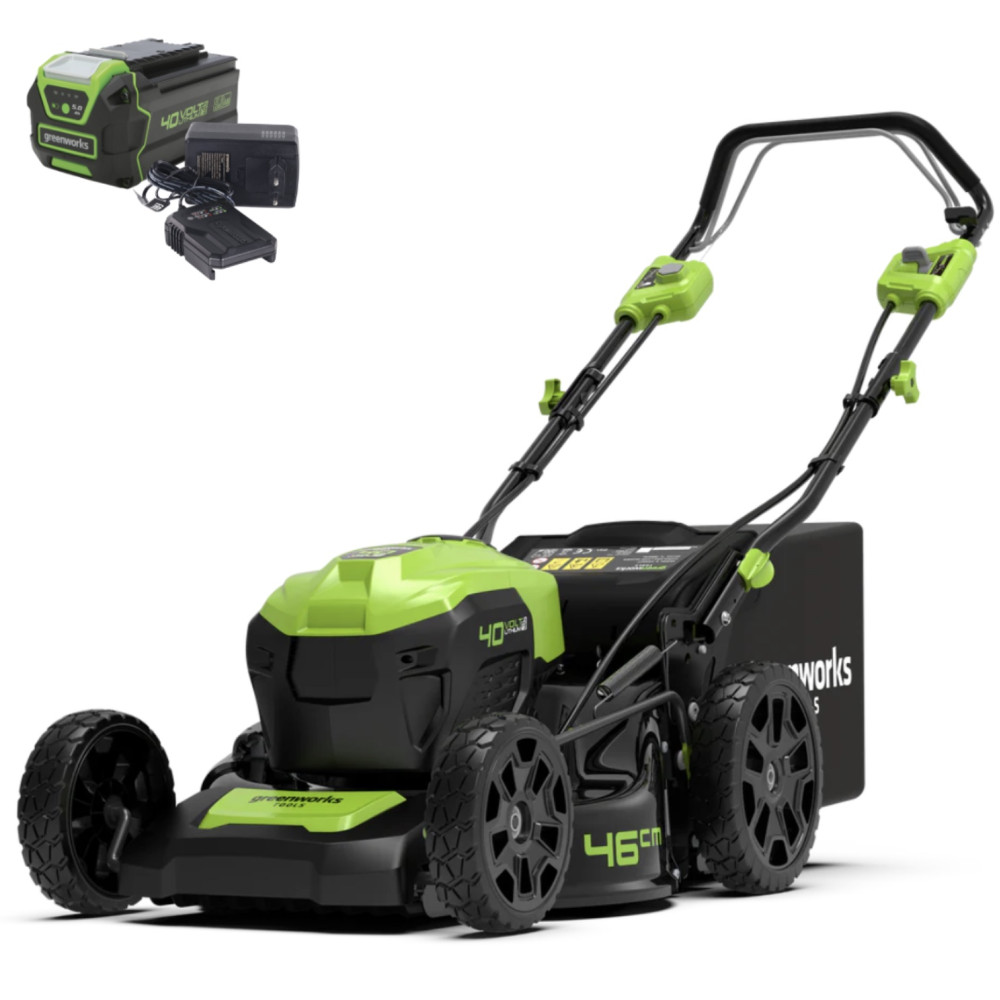Газонокосилка работает от аккумуляторов Greenworks 40В — это удобно для владельцев других инструментов этой серии, так как система питания полностью совместима.