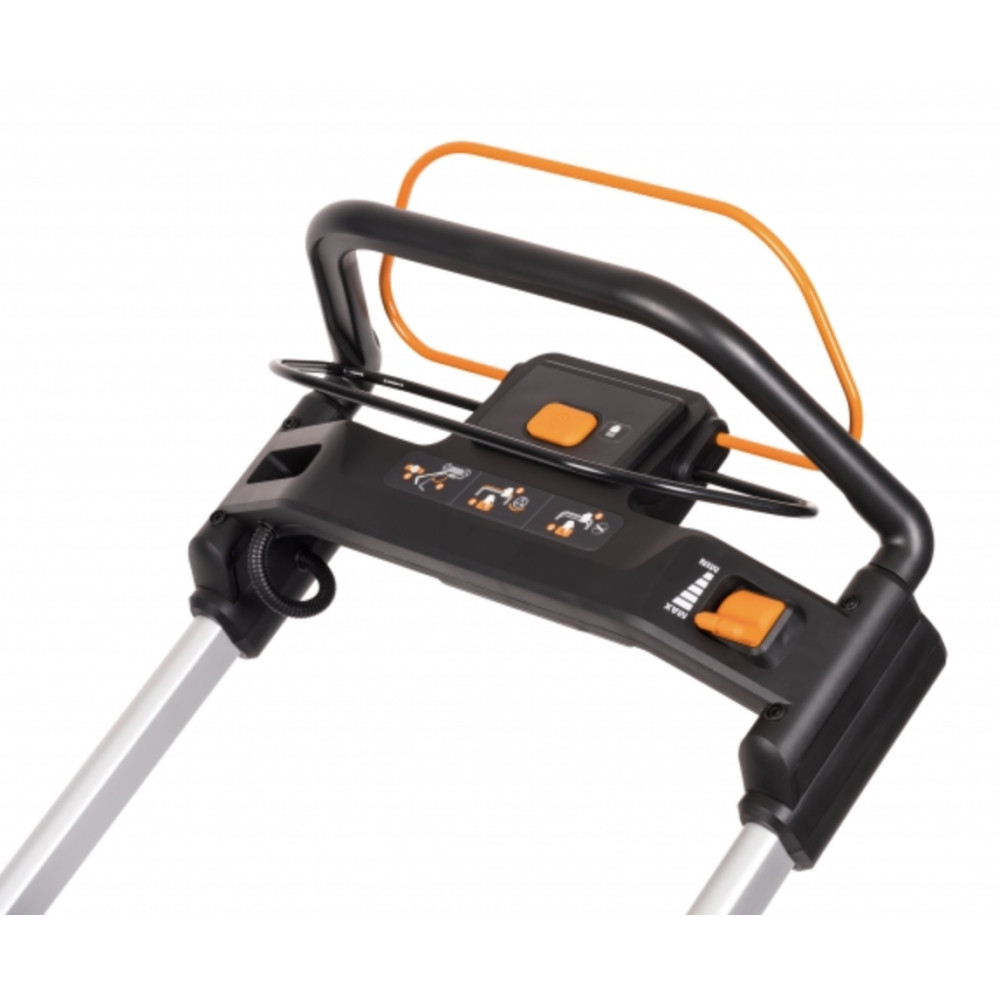 - Самоходный задний привод: несмотря на внушительные габариты, управлять косилкой очень легко. Она едет сама, а плавная регулировка скорости на рукоятке позволяет подобрать идеальный темп движения под ваш шаг.