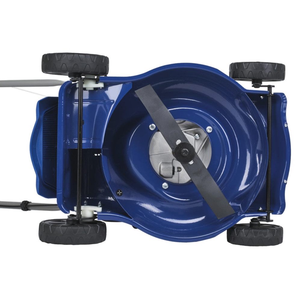 - Стальная аэродинамическая дека. Корпус из прочной листовой стали с антикоррозийным покрытием надежно защищает внутренние узлы и не боится попадания мелких камней. Особая геометрия деки создает мощный воздушный вихрь (Aero-blade), который поднимает полегшую траву перед срезом и обеспечивает идеальное заполнение травосборника.