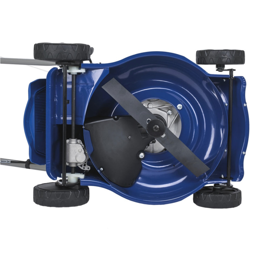 - Колеса на двойных шарикоподшипниках гарантируют долговечность ходовой части и мягкий ход косилки даже по неровному рельефу.