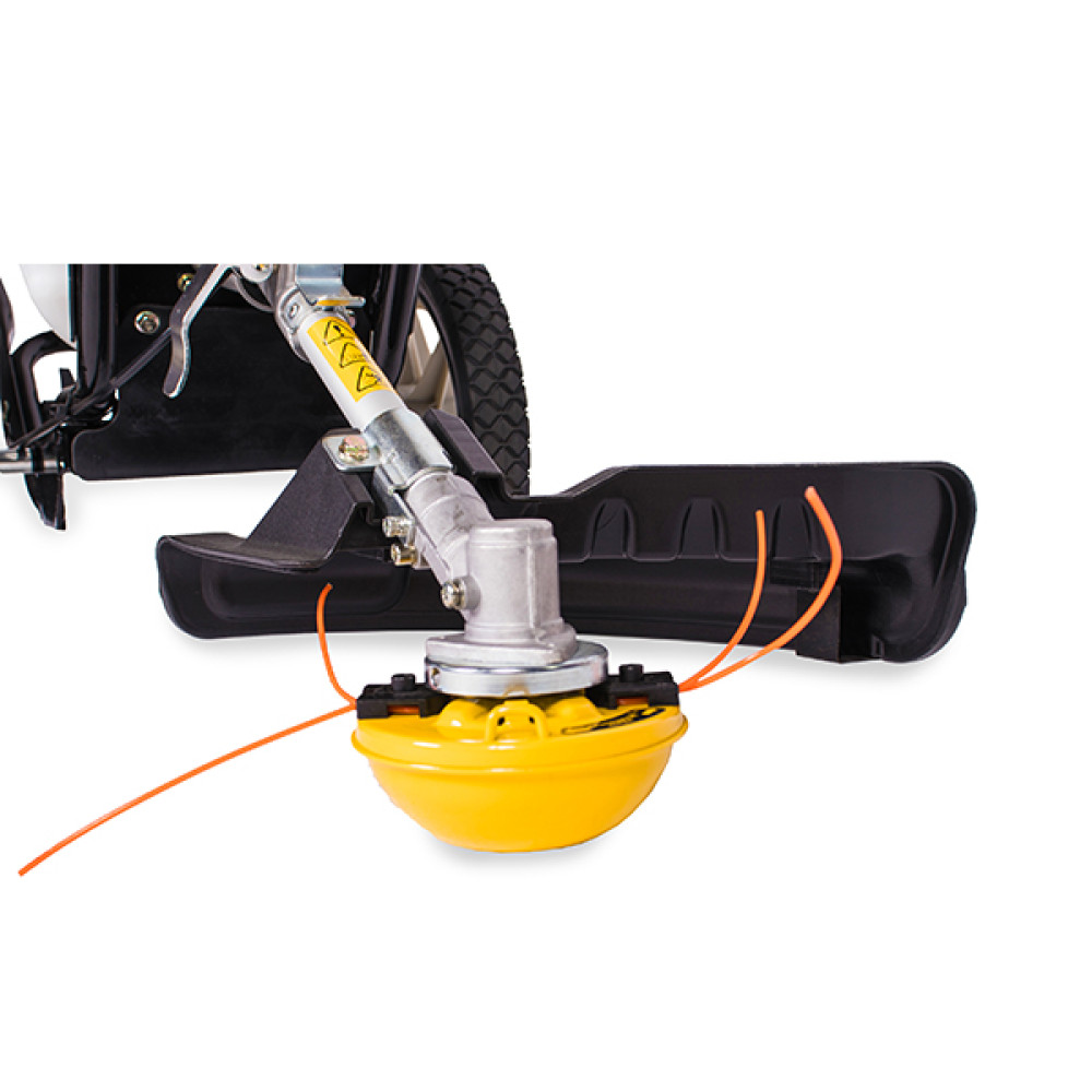 Газонокосилка снабжена укороченным валом и триммерной головкой, усиленной металлической чашкой.
