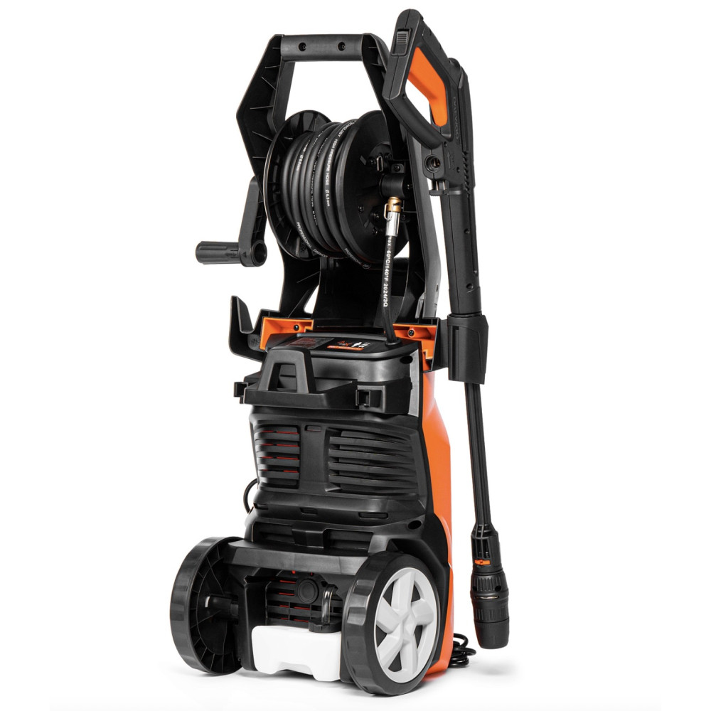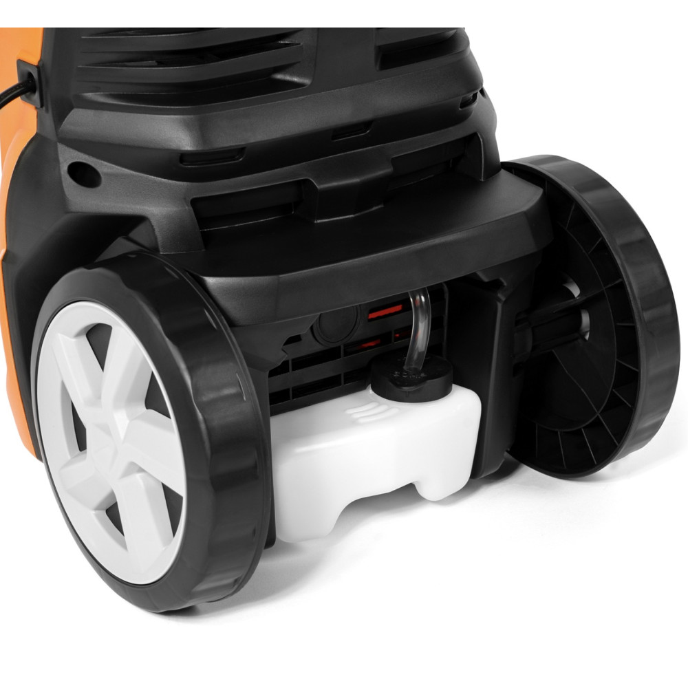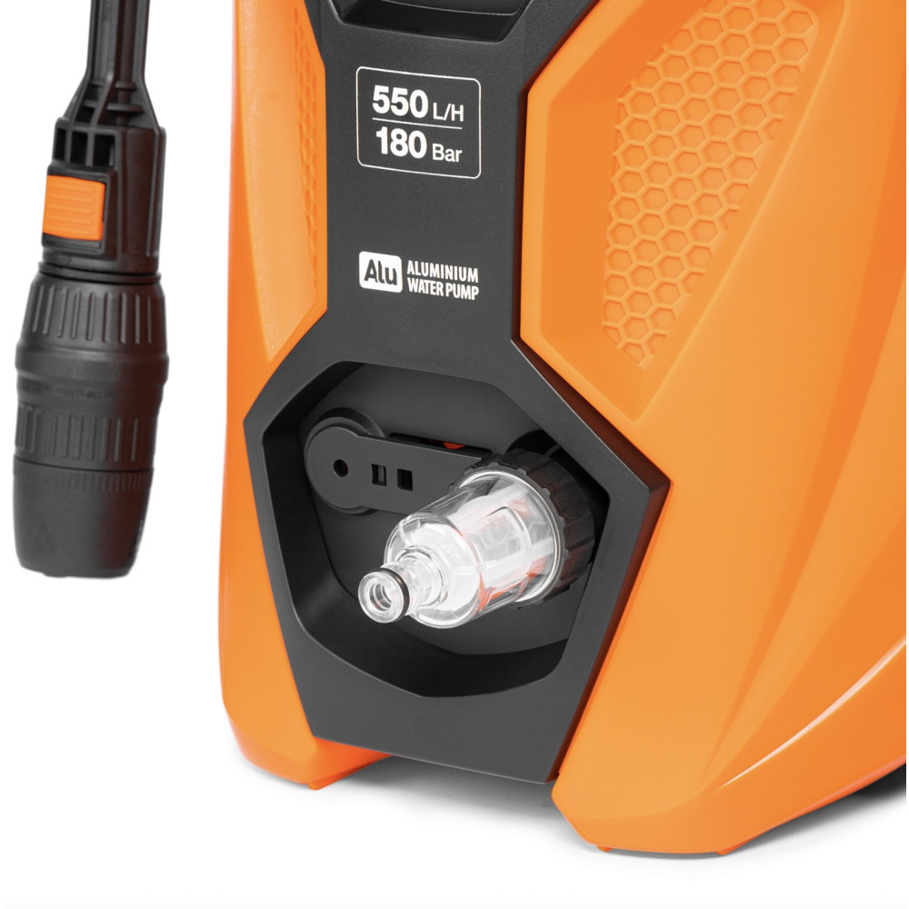 Модель оснащена электрическим двигателем мощностью 2300 Вт, который обеспечивает рабочее давление до 180 бар и производительность до 550 л/ч. Это позволяет эффективно удалять даже стойкие загрязнения — засохшую грязь, налет, мох и остатки строительных материалов.