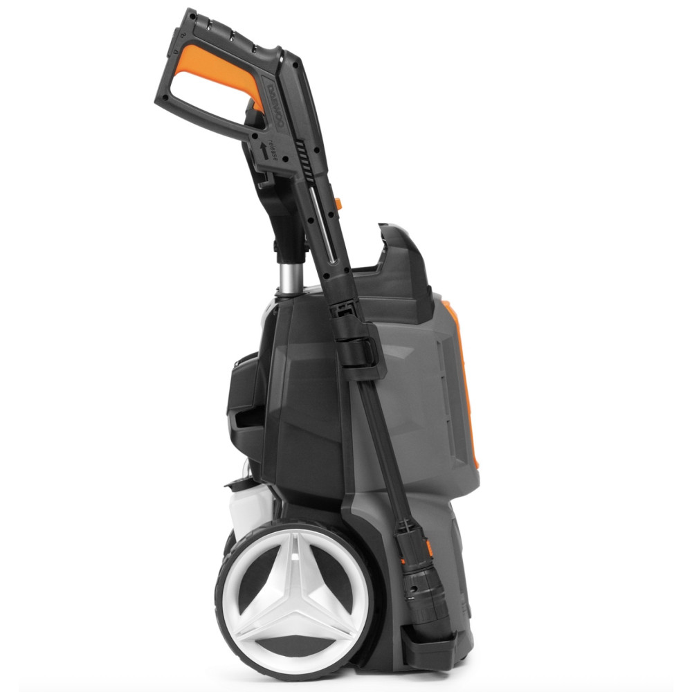 - Удобство работы. Мойка оснащена длинным 8-метровым шлангом высокого давления и 5-метровым кабелем. Это дает вам огромный радиус действия без необходимости постоянно перетаскивать сам аппарат. Для удобного перемещения предусмотрены большие колеса и телескопическая ручка.