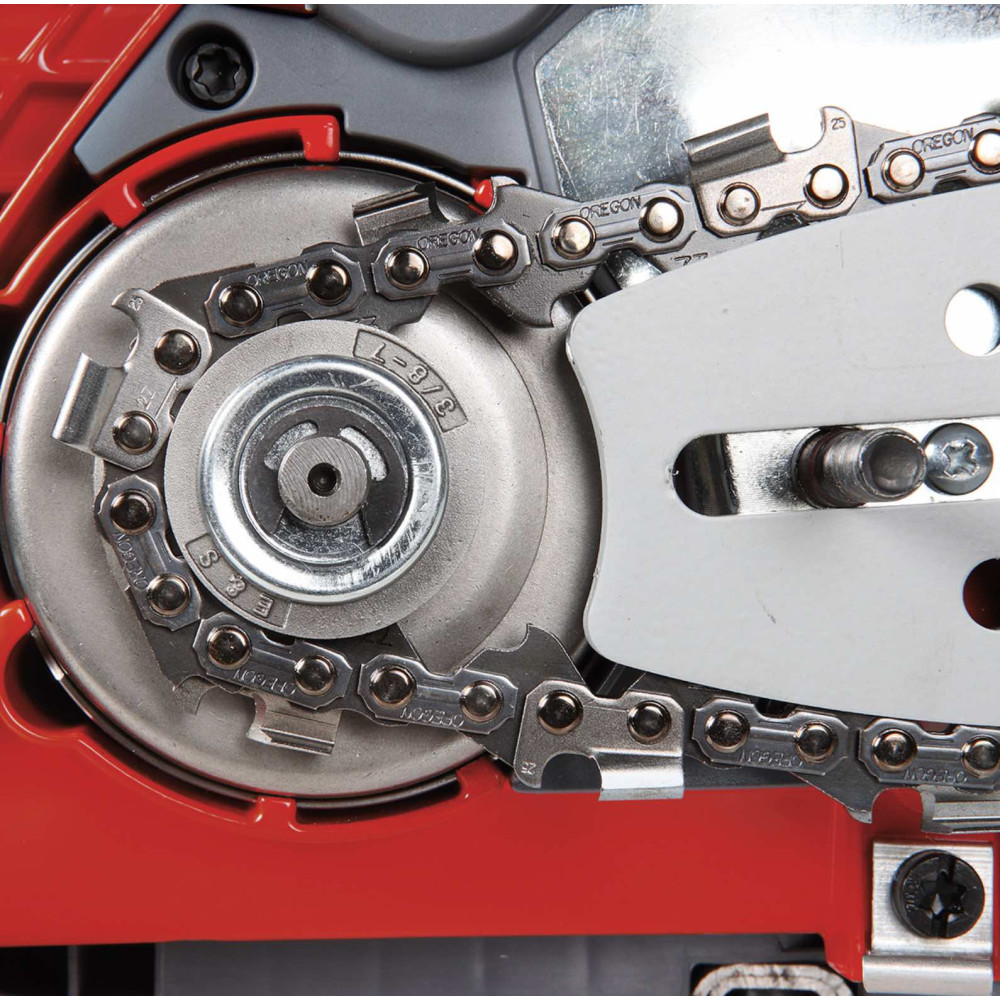- Боковой натяжитель цепи упрощает регулировку и делает ее безопасной, без риска контакта с режущими элементами.